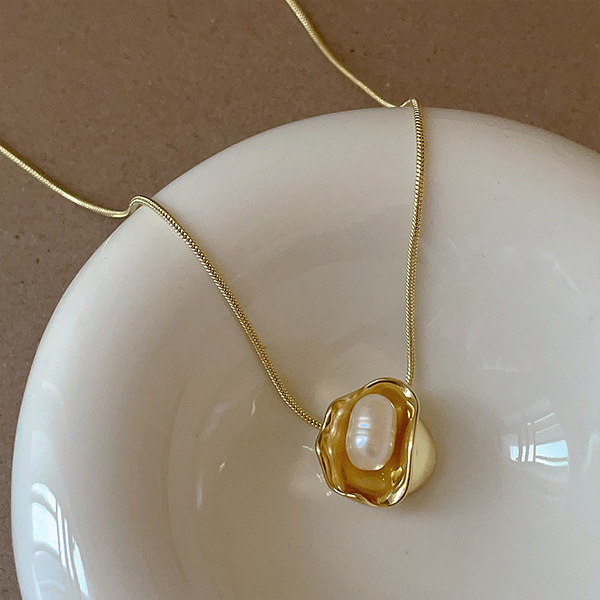 French Style Broad Bean Freshwater Pearl Necklace – 14K Gold-Plated Bowl Pearl Pendant